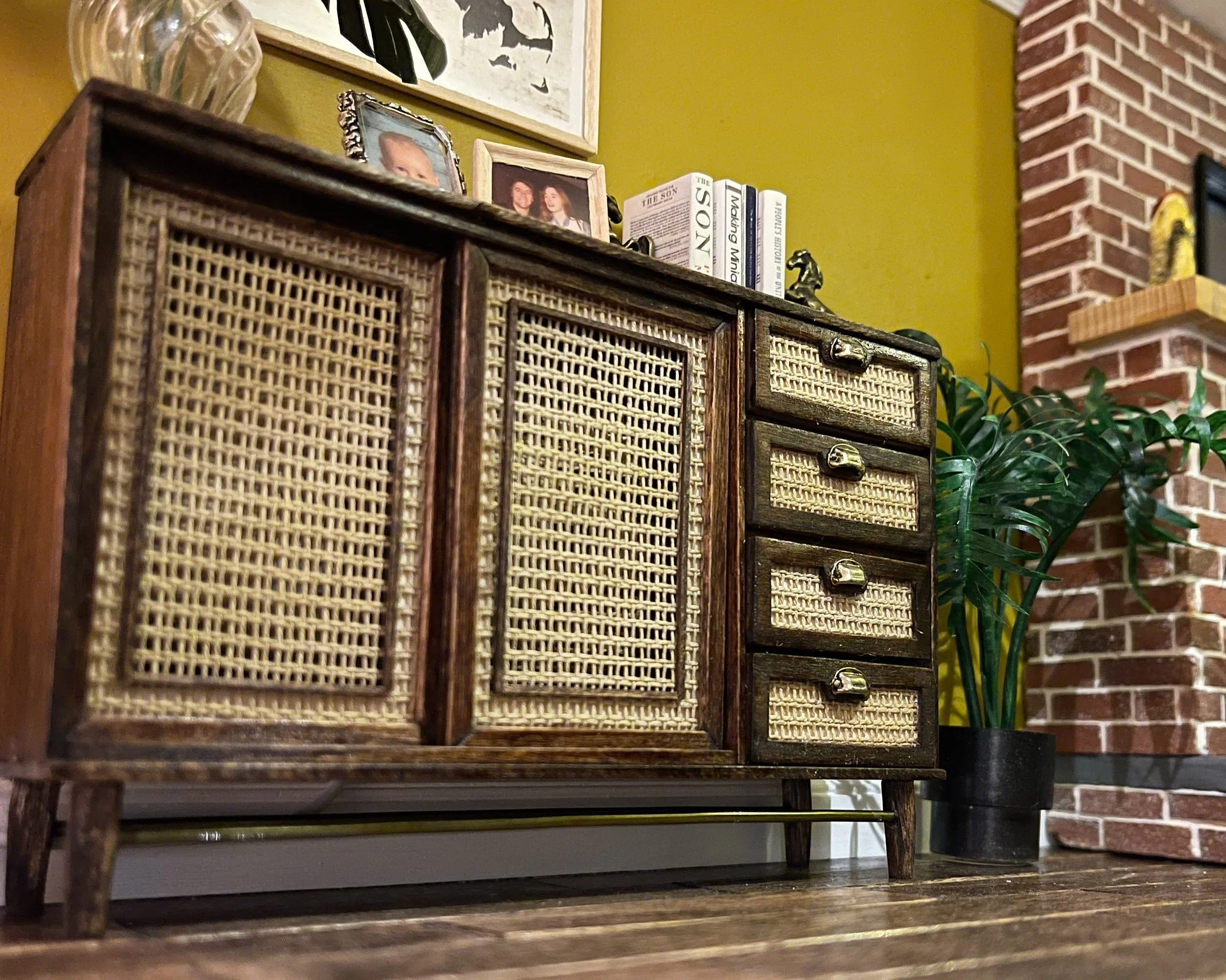 This buffet is handmade from basswood stained in a rich mahogany finish. I designed it to be a unique statement piece for my dollhouse living room, with working drawers and sliding doors for added realism. I created the paper pattern in Adobe Illustrator and cut each piece using my micro band saw. The layered combination of rattan and metal details gives it beautiful texture and depth—one of my favorite parts of this build.